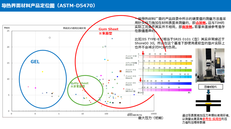 一般市面上各大厂商的导热材料在产品目录中记载的硬度值测量方法,是基于用针施加力于材料表面的点接触方式。这与TIM材料的实际使用条件——面接触不同,如果只是参考这些数据会导致与实际使用效果产生差异。